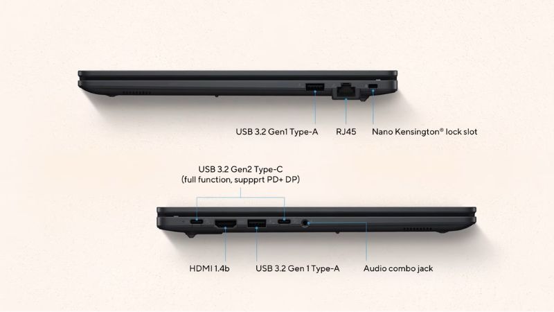 ExpertBook B1 BM1403CDA-S60974W mang đến hệ thống cổng đa dạng: USB-A, USB-C, HDMI, jack 3.5mm. Điều này giúp dễ dàng ghép với màn hình, máy chiếu hay thiết bị ngoại vi.