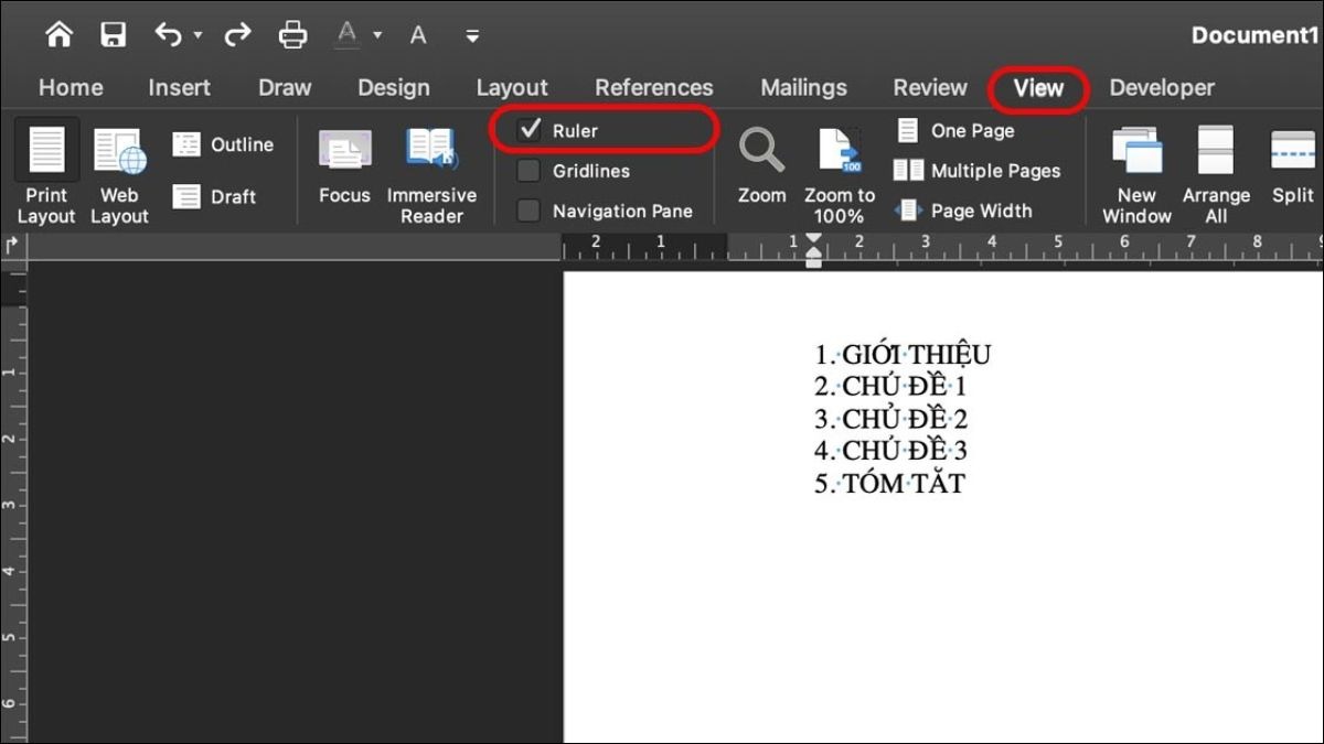 Hiển thị thanh Ruler bằng cách tích chọn Ruler trong tab View.