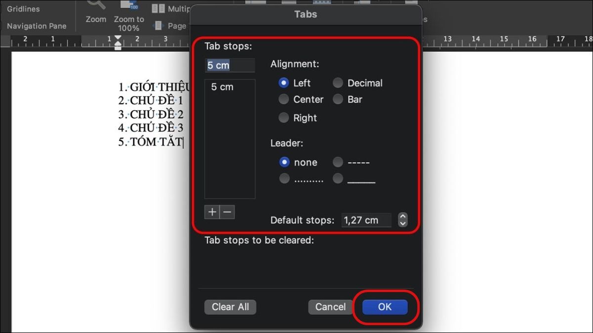 • Bước 4: Hộp thoại Tabs hiện ra, sau đó bạn tiếp tục điều chỉnh các thông số (gồm Tab stop position, Alignment, Leader) trong hộp thoại như đã hướng dẫn trên.