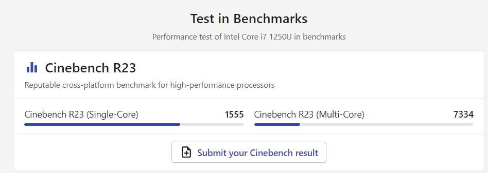 Với bài test Cinebench R23 về khả năng xử lý đồ họa và thiết kế hình ảnh, CPU Intel Core i7 mang lại kết quả 1555 điểm xử lý đơn nhân và 7334 điểm xử lý đa nhân. Với cương vị là laptop Ultrabook thì đây là các thông số phù hợp để những anh/chị quản lý, điều hành doanh nghiệp có thể “xử đẹp” các tác vụ văn phòng.