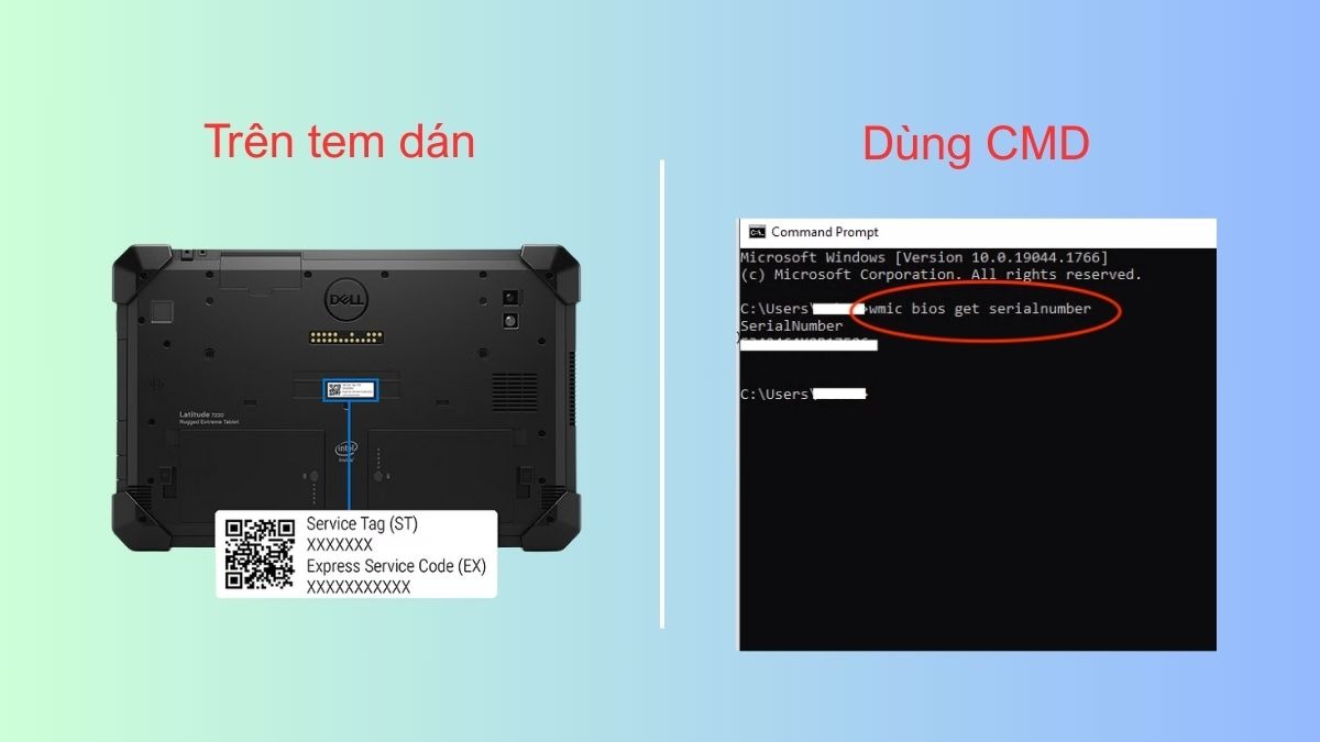 Bước 1:Xác định Service Tag của laptop Dell ghi trên tem dán ở mặt dưới hoặc cạnh của máy. Nếu không có, bạn mở Command Prompt (cmd), nhập lệnh "wmic bios get serialnumber" rồi nhấn Enter. Dãy ký tự hiện ra chính là Service Tag.