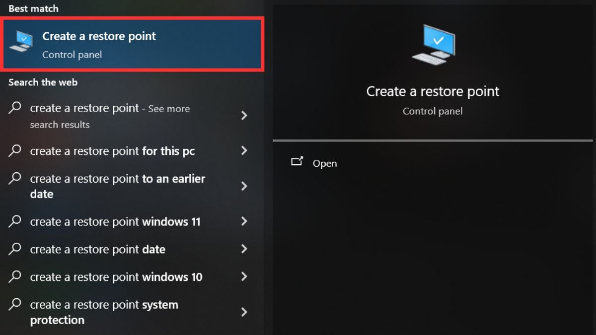Bước 1: Nhập "Create a restore point" vào thanh tìm kiếm của Windows và chọn kết quả tương ứng.