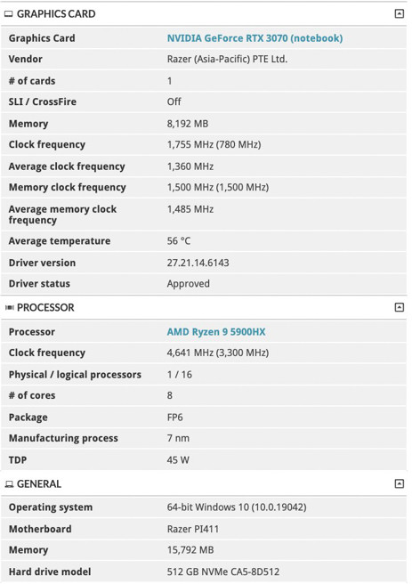 Người dùng Twitter _rogame sau khi nghiên cứu các cơ sở dữ liệu có trong 3DMark, phát hiện ra một mục mới cho thấy máy tính xách tay Razer PI411 có cấu hình dGPU R9 5900HX đi kèm với card đồ hoạ RTX 3070 “Max-Q”.Tuy nhiên, vẫn còn một phiên bản RTX 3080 với TGP thấp nữa, với số VRAM và nhân CUDA nhiều hơn, dĩ nhiên so với phiên bản RTX 3060 TGP cao thì không thể bằng về hiệu năng. Nhưng với việc Razer công bố chiếc Blade 14 mới này sẽ là gaming laptop mỏng nhẹ nhất từ trước tới nay, sẽ rất khó để đưa một card đồ hoạ có hiệu năng cao vào được. Thêm nữa, tuy RTX 3080 có biến thể điện năng thấp, hay còn được biết là Max-Q, không rõ Razer có đưa biến thể này lên chiếc Blade 14 mới hay không.